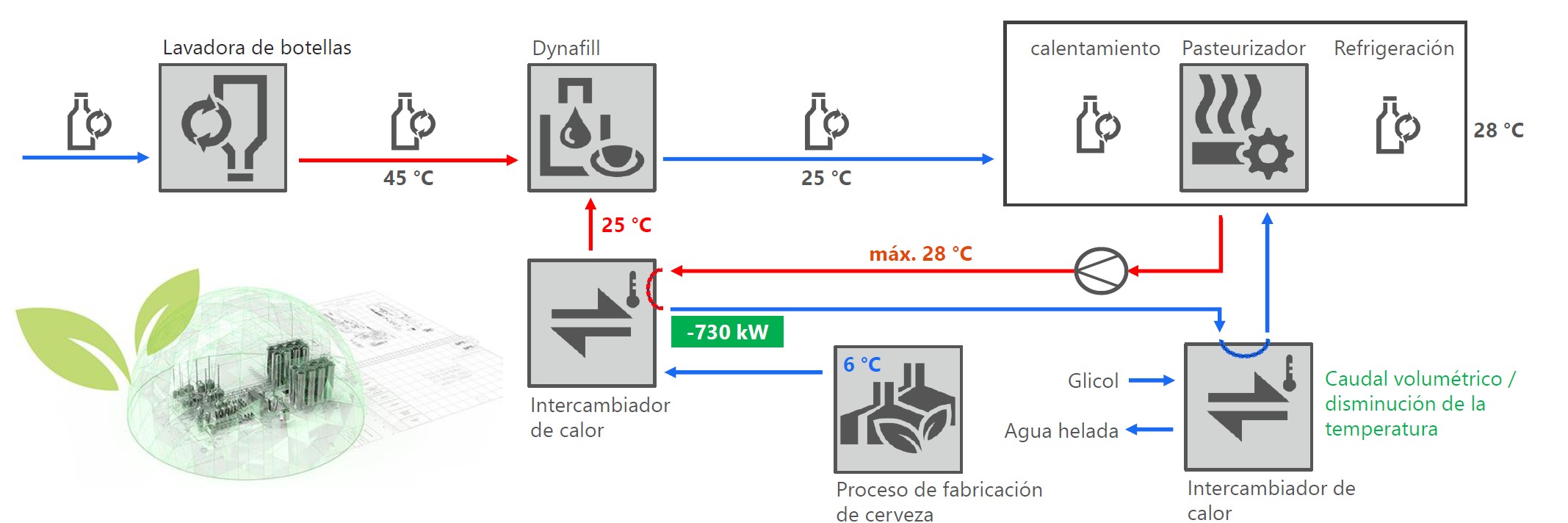 Krones concibe sus máquinas de forma integral, lo que significa que no solo tenemos siempre en mente la máquina individual, sino que también la incluimos en el concepto global. En el caso de la Dynafill, esto significa que somos conscientes de las oportunidades que ofrece el llenado en caliente en el tema del ahorro de energía. Así, hemos desarrollado un concepto integral con el que es posible reciclar energía de refrigeración en otras fases del proceso de producción o llenado.